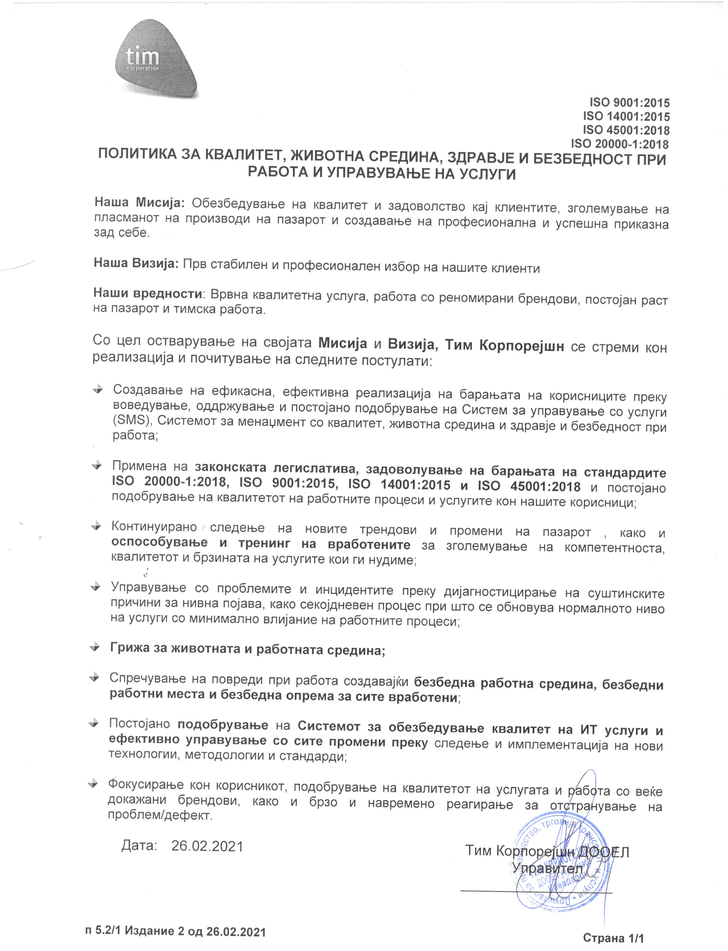 Политика за квалитет, животна средина, здравје и безбедност при работа и управување на услуги